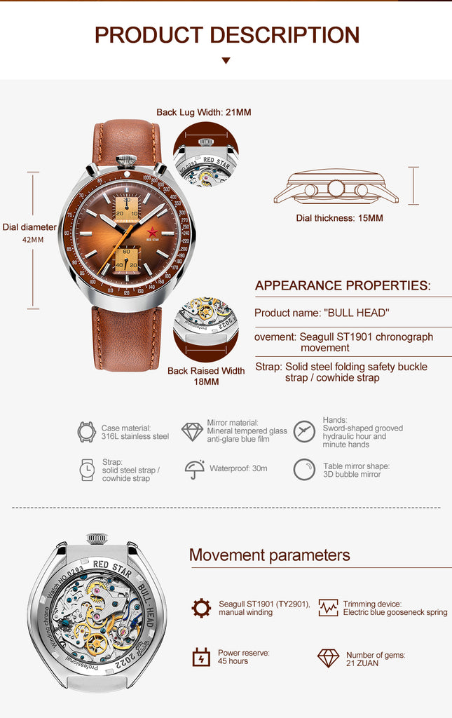 1. About the Red Star Bullhead Chronograph Watch (The watch come with 1 piece leather strap and 1 piece extra metal strap made of stainless steel, total 2 straps):